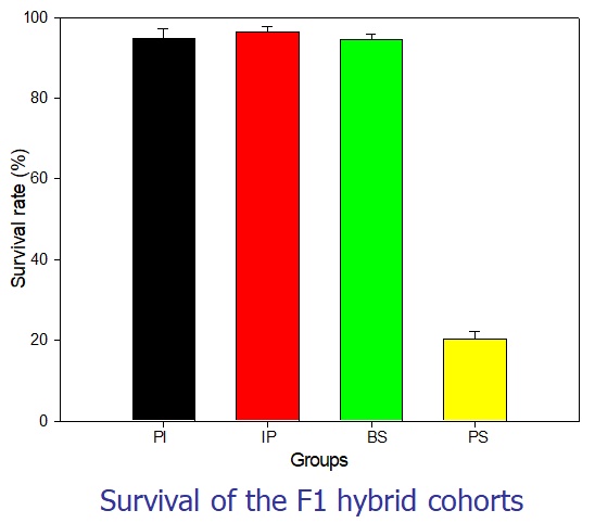 ②体质量增长:群体杂交结果,体质量增长 PI、IP接近,且两者明显大于BS和PS,PS最低的原因在于高温抑制其生长。