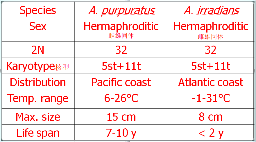 引进种与本地种生物学对比: 紫扇贝和海湾扇贝同属于Argopecten 属的品种,染色体数目和核型相同,存在互补的经济性状,包括壳色、生长速度、个体大小、适应温度、寿命等,通过种间杂交有望培育出外观漂亮、生长速度快、个体大且温度适应范围广的扇贝新品种。