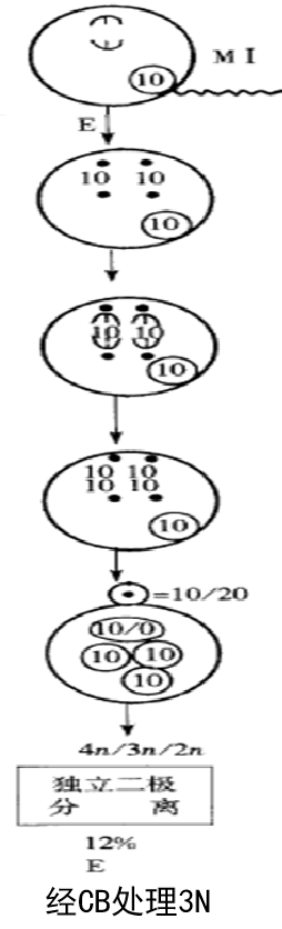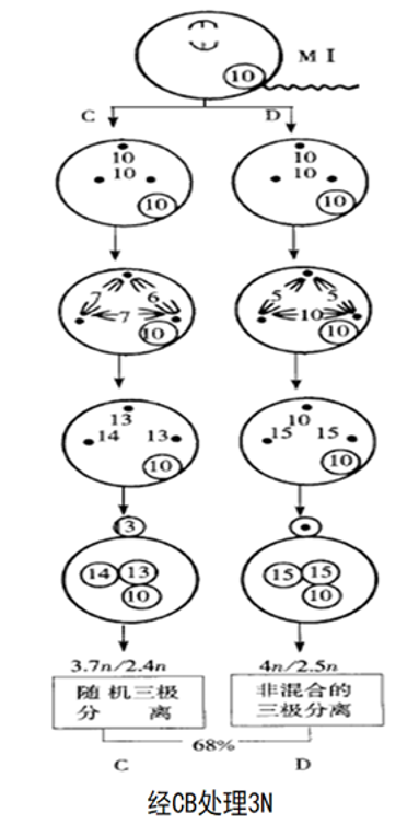 由于某种原因同源染色体或姐妹染色单体在后期没有分开一组染色体进人到同一配子中,导致配子中染色体数目的加倍形成2n 配子。这样的配子经受精后形成倍性不同于亲代的多倍体,如三倍体,但其子代的可育性很低。