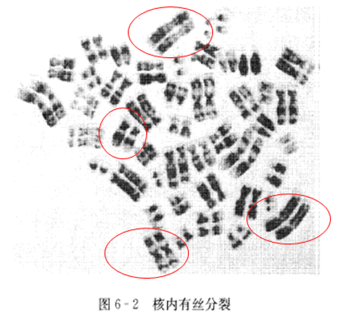 核内有丝分裂(endomitosis,核内复制):是体细胞在正常有丝分裂中,染色体复制一次,但至分裂中期,核膜没有破裂消失,也无纺锤丝的形成,因此每对染色体形成4条染色体,称为双倍染色体(diplochromosome),这时染色体两两平行排列在一起(图6-2),结果形成的细胞是四倍体。其后经过正常的细胞分裂,形成两个子细胞均为四倍体。