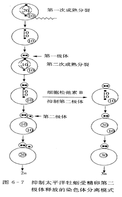 Guo等(1994)在太平洋牡蛎(2n=20)受精卵的细胞学观察研究中发现,经CB处理抑制第一极体释放后,染色体产生正常和非正常的分离,前者形成正常的三倍体,称为MI 三倍体,但仅占7%;后者大部分形成非整倍体2.4n/2.5n/3.7和少量的整倍体2n/3n/4n。