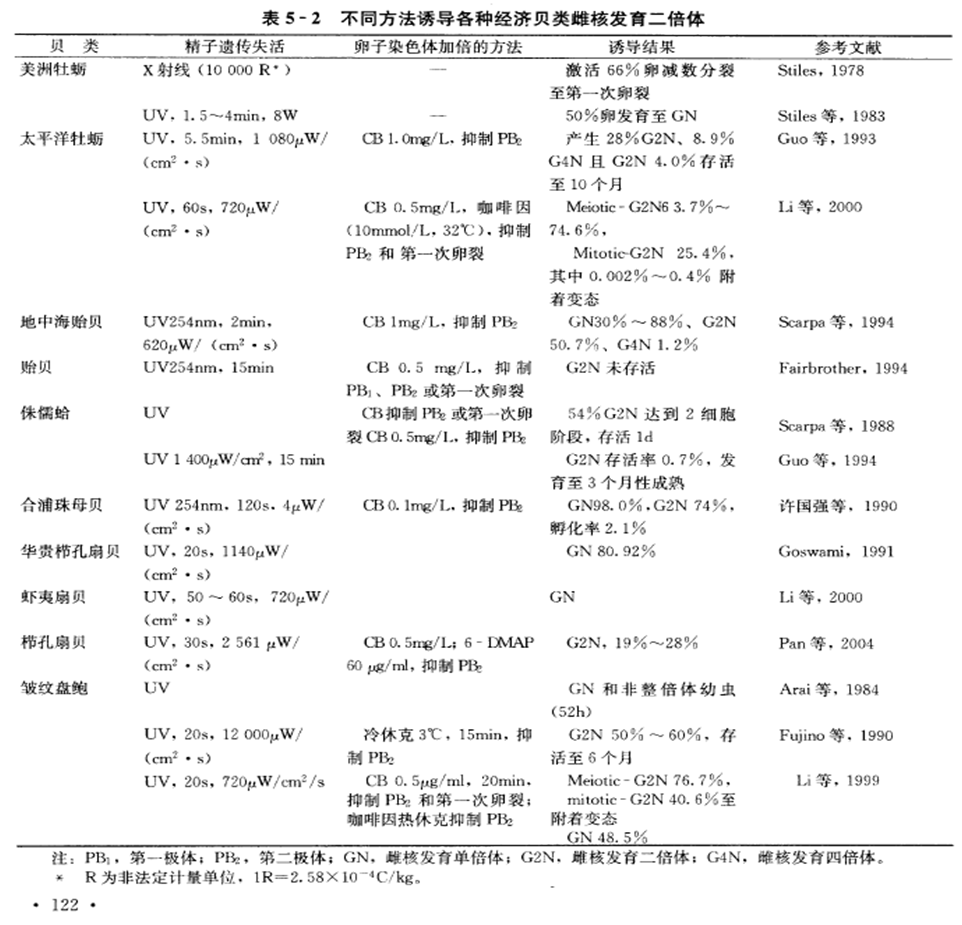 ②在海产经济贝类方面,人工雌核发育的研究开展较晚,至今还没有培育到成体的报道。据统计,目前已在10种海洋贝类进行了人工诱导雌核发育的研究(表5-2),其中双壳类9种,腹足类1种。