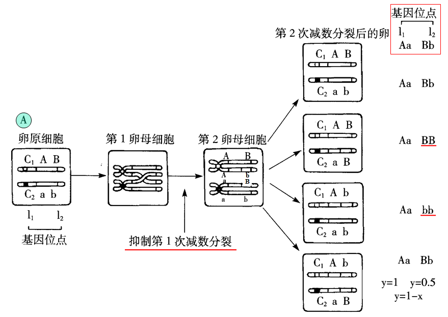 杂合型亲本的第一极体抑制型(如图A)和第二极体抑制型(如图B):