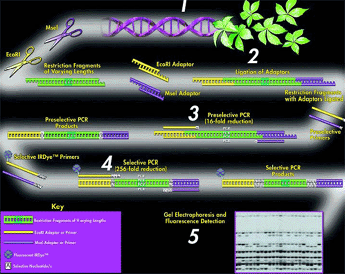 该技术的独特之处在于所用的专用引物在知道 DNA 信息的前提下就可对酶切片段进行PCR 扩增。为使酶切浓度大小分布均匀,一般采用两个限制性内切酶,一个酶为多切点,另一个酶切点数较少,因而 AFLP 分析产生的主要是由两个酶共同酶切的片段。