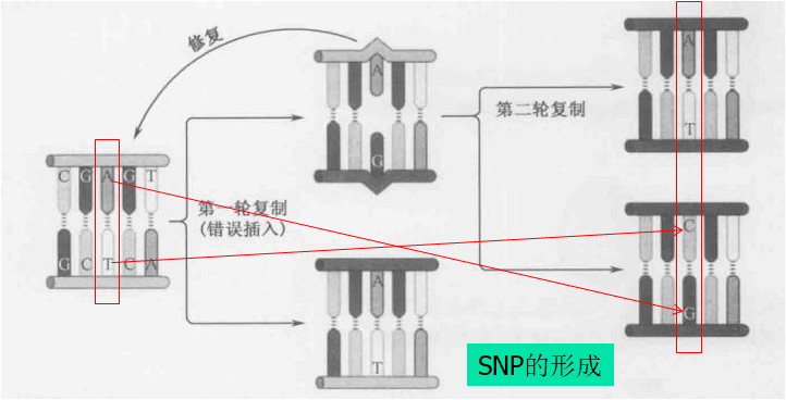 没有被及时除去的突变可以通过下一轮复制永久插入基因组,形成SNP。
