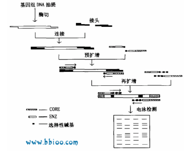 基因组DNA提取→ 限制性核酸酶双酶切基因组DNA→DNA片段两端连接上特定的接头→ 选择扩增→ 聚丙烯酰胺凝胶电泳→ 凝胶转移,干胶处理→自显影。