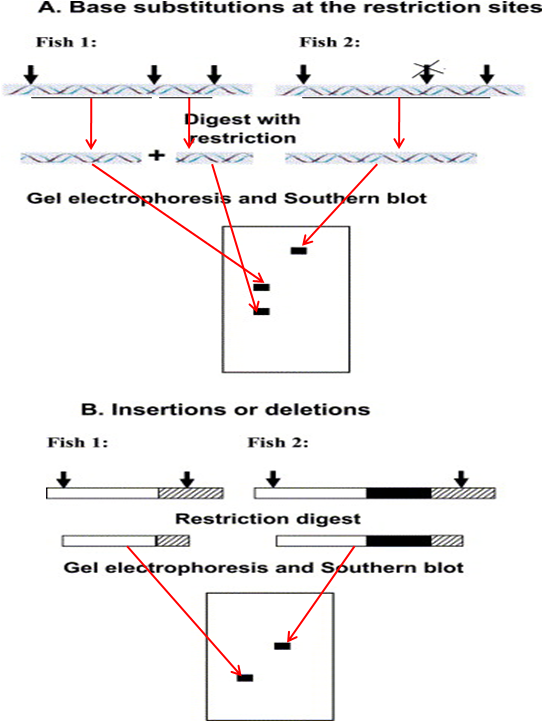 (1)定义:以限制性片段长度多态性 (restriction fragment length polymorphism)作为分子标记,是发展最早的分子标记技术,该标记通过限制性内切酶酶切不同个体基因组DNA之后,采用Southern杂交技术获得含有与探针序列同源的酶切片段长度上的差异,进而开展多态性分析。