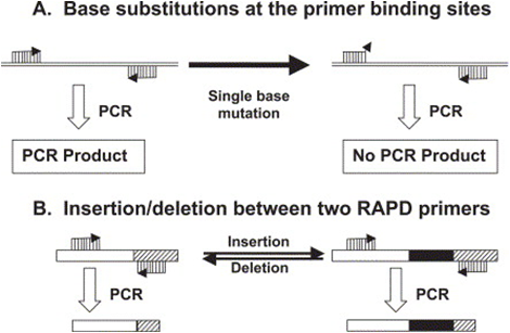 (2)原理:RAPD是利用一系列不同碱基顺序的随机引物对所研究的基因组DNA进行PCR扩增,扩增产物(即DNA片段)通过琼脂糖或聚丙烯酰胺凝胶电泳分离。经特定的染料染色后在紫外检测仪上检测扩增产物的多态性,这些扩增的DNA片段长度的多态性反映了基因组相应区域的DNA序列多态性。
