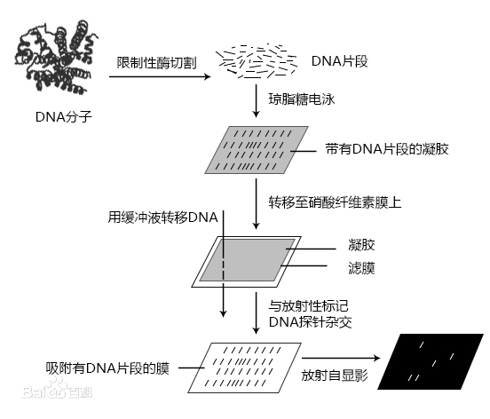 Southern印迹杂交是1975年由英国人southern创建的。Southern印迹杂交的基本方法是将DNA标本用限制性内切酶消化后,经琼脂糖凝胶电泳分离各酶解片段,然后经碱变性,Tris缓冲液中和和高盐下通过毛吸作用将DNA从凝胶中转印至硝酸纤维素膜上、烘干固定后即可用于杂交。附着在滤膜上的DNA与32P标记的探针杂交,利用放射显影术确立探针互补的每一条DNA带的位置,从而可以确定在众多消化产物中含某一特定序列的DNA片段的位置和大小。