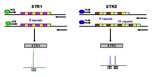 (1)定义:以简单重复序列(Simple Sequence Repeats, SSRs),又称微卫星DNA(microsatellite DNA)或短串联重复序列(Short Tandem Repeat ,STR)为分子标记,该标记根据微卫星DNA两端的单拷贝序列设计一对特异引物,利用PCR技术,扩增每个位点的微卫星DNA序列,通过电泳获得核心序列的长度多态性,并对其多态性进行分析。