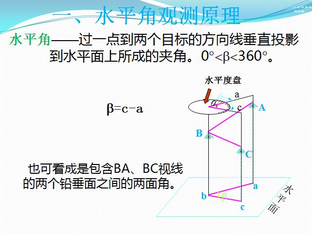 水平角:用于确定点的平面位置(过一点到两个目标的方向线垂直投影水平面上所成的夹角。0°<b<360°)