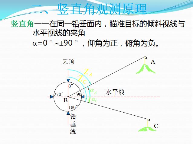 竖直角:用于两点间高差计算(在同一铅垂面内,瞄准目标的倾斜视线与水平视线的夹角(也叫竖直角)。a=0 °~±90 °,仰角为正,俯角为负)