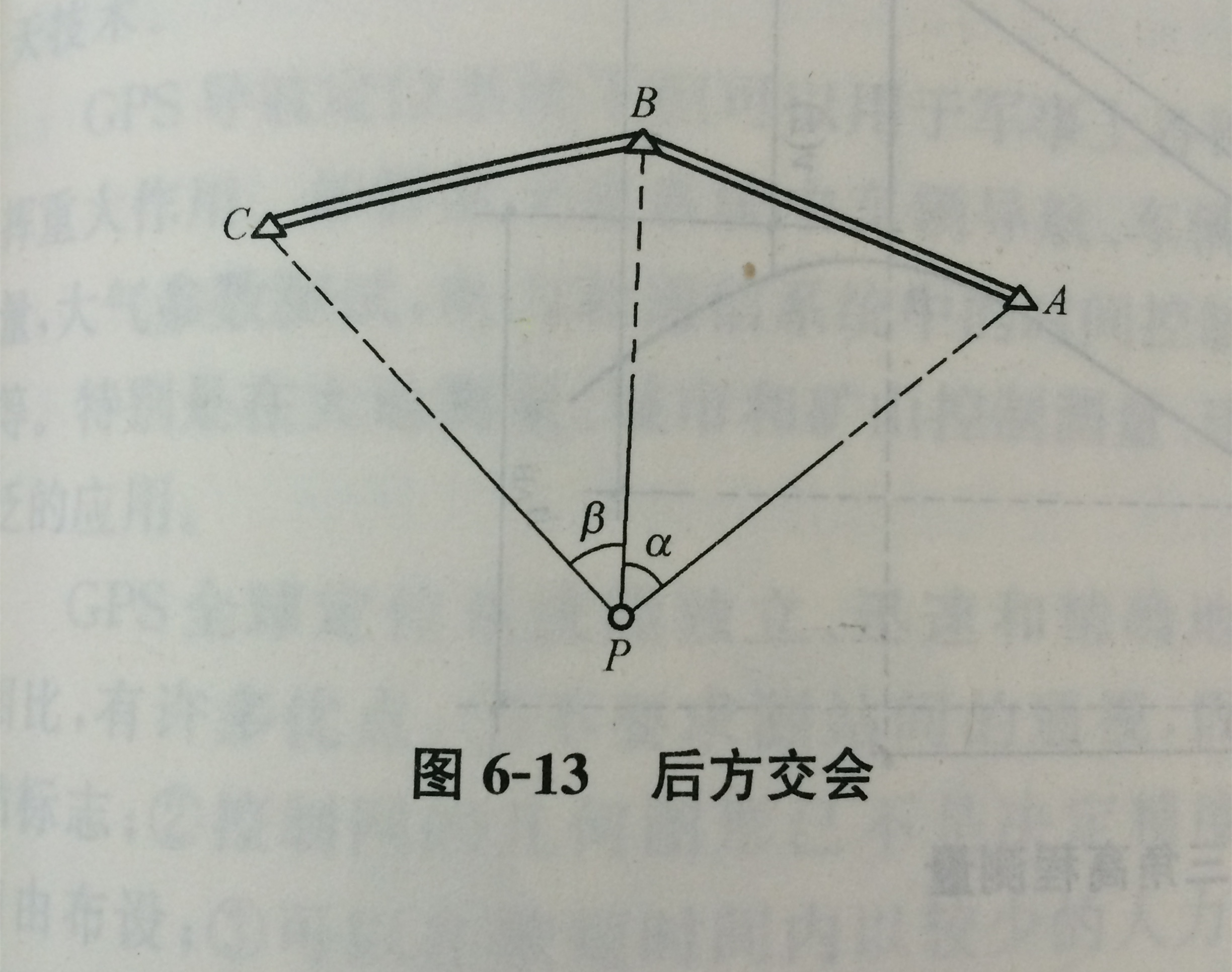 如图所示,后方交会是在待求点P上安置经纬仪,观测三个已知点A、B、C之间的夹角,然后根据已知点坐标和夹角计算P点坐标
