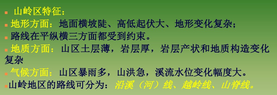 一般谷底不宽,两岸阶地较窄,谷坡时缓时陡,间有浅滩和峭壁。山区河流平时流量不大,但山洪暴发时,洪流常夹带泥砂、砾石、树木急速下泻,冲刷河岸,为害甚大。河谷地质复杂,常有滑坍、岩堆、泥石流等病害发生。寒冷地区的背阳峡谷日照少,常有积雪、雪崩和涎流冰等现象。这些自然条件是沿河线选线必须考虑的因素。但沿河线与山区其他线型相比,却具有纵坡平缓,工程量小,施工、养护及运营条件较好等优点,常常是山区选线优先考虑的方案。