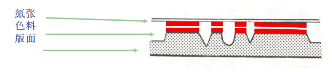 指色料部份在版材的表面,而版材表面并沒有高低差別,而是利用“油水不相混”的原理。