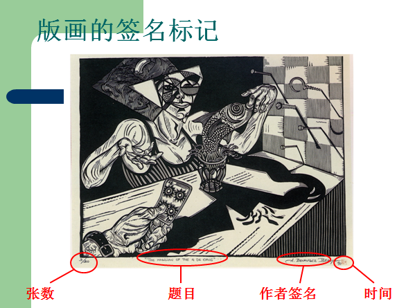 通常,现代版画的签名格式为:在画面的左、右及上面留有相同尺寸的白边,下面的白边宽度要比其他三边宽一些,在此空白处用铅笔签名。从左至右依次为:左边标明总印数和该作品排序(以“/”分割,分母为总印数,分子为该作品排序),中间标明作品名称,右边标明作者姓名和创作年代。如:“15/80”表示编号作品共有80张(总印数80张),而本幅排序为第15张。无论版画作品由谁来制版﹑印制,画家一旦签署个人姓名,即表示画家已认可此作品为自己的原创作品。