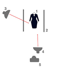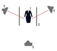 使用两个布光光源,布光摆放在商品侧逆光的位置,如图3-5所示。这种布光方式,产生两个方向的阴影,遮挡服饰正面。侧逆光更适合展现模特轮廓和线条。