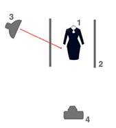 商品拍摄最基本的布灯灯位,是在拍摄者一侧(左或右)大概45度的位置,模拟自然光的照明效果。这属于前测光的一种打光方式,符合一般的视觉习惯。多光源拍摄,主光位置决定了照明的主力方向,服饰光亮最多的一面,主光以外的其他光源都是辅助光线,以达到拍摄的基本目的和效果。