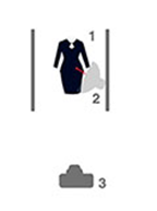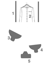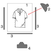 布灯光源离拍摄物很近,照明中点朝向服饰中心,如图3-6所示。整个光源集中在衣服的某个点上,近距离布光,光线无法均匀柔和的投射到服饰商品上,导致某个部分光亮特别明显,其他地方都是阴影。需要突出服饰某个细节或者亮点,可以使用这种布光方式。
