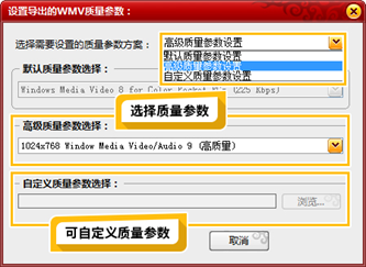 点击“开始录像”后,弹跳出“设置导出的WMV质量参数”,一般为默认质量参数设置,可以让录制屏幕的画面效果达到“中高低”等不同的状态,根据视频需要进行选择,如图9-24所示。