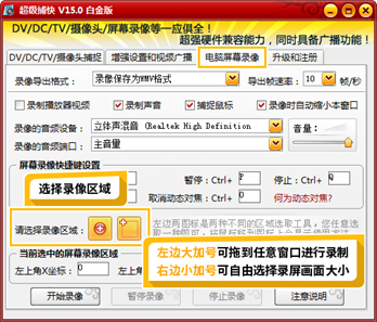 先选中“电脑屏幕录像”,找到“请选择录像区域”,有两个按键,一个大加号,是可以拖动鼠标到任意想录制的区域进行录制;另一个小加号,是可以自定义录制屏幕的区域范围,拖拉鼠标就可以框选录制的画面大小,如图9-23所示。