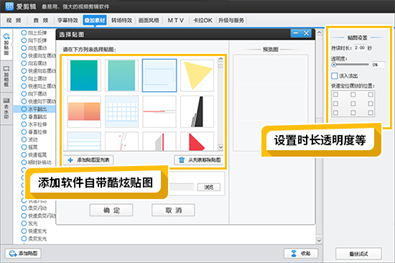 选择“叠加素材”按键(如图9-28所示),爱剪辑也自带了很多自创的贴图,贴图使用时可以叠加,右侧“贴图设置”里,可以为贴图设置动画效果,让贴图也能“动起来”,结合视频内容,调整贴图时长透明度等,整个画面会更加生动。除了可以使用自带的贴图以外,点击“选择贴图”按键右下方的“添加贴图至列表”,还可以自行导入本地图片,不断根据需要更新,丰富贴图库。