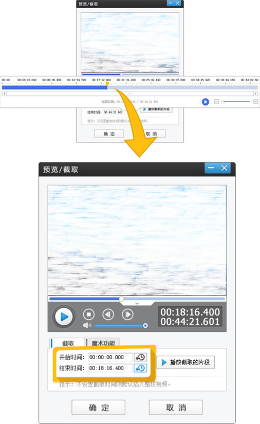 3、导入视频后,双击导入视频面板,弹跳出“预览/截取”对话框,使用快捷键Ctrl+E调整视频的时间轴,按鼠标左键拖拉黄色小箭头选取视频的开始时间和结束时间(如图9-7所示),也可以设置截取的视频段落。这种方法还可以直接在“预览/截取”面板上,直接输入视频开始时间和结束时间,也可以分割截取视频段落。