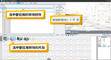 视频转场效果就是一个视频片段过渡到下一个视频片段的效果。使用时转场效果,让上一个视频过渡到下一个视频更加自然有趣。在“已添加片段”列表里选中后一个视频(如图9-13所示),上方“转场特效”面板选择应用到两个视频片段之间的特效,点击“应用/修改”按键,即可在前后两个片段中插入转场效果。可设置转场效果的时长,即过渡时间的快慢,还可调整转场的入场和出场效果,“变亮式淡入淡出”、“变暗式淡入淡出”和“透明式淡入淡出”等,根据视频过渡要求进行选择。
