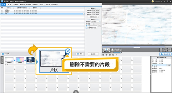 1、在视频编辑主界面的下半部分,找到已经导入视频的右上角,预览视频时间进度条,打开“创新式时间轴”面板,点击黄色的小三角,一个向下的小箭头,按鼠标左键把箭头拖到需要分割视频的位置(如图9-4所示),通过键盘的上下左右键可以精确选取小箭头的停留位置,点击右下方一个剪刀图标,或按剪切分割的快捷键Ctrl+Q,即可把视频剪切分割成为两段视频。通过这种操作方法,可以将视频分割成为多个小片段。在“已添加片段”列表中,选中不需要的视频,点击小视频右上角的蓝色小叉,可以将其删除,如图9-5所示。保留自己需要继续编辑的视频,点击打开音频图(如图9-6所示),编辑进度条下方出现音频波形图,根据波形图形波动的高低,实现按照节奏或者音乐段落将视频分割。