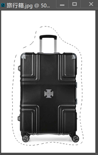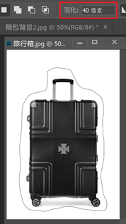 2、对“旅行箱”素材进行抠图时,可将“套索工具”的羽化值修改为40,如图2-52所示。羽化后抠图界柔且不生硬,长按鼠标沿着“旅行箱”画出大概的形状,鼠标终点要回到起点,两点重合形成闭合区域,松开鼠标左键,出现框选虚线范围,如图2-53所示。