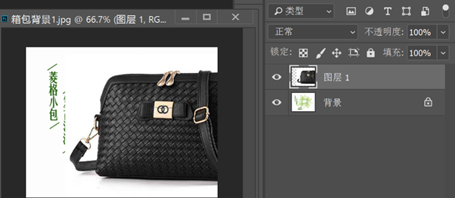 (1)使用移动工具,移动矩形选框选中的“菱格包”区域,长按鼠标左键拖拽选框,将其放入“箱包背景1”的图片中,如图2-36所示。