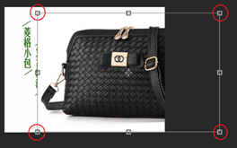 (2)调整“菱格包”的大小和位置,菜单栏“文件”→“自由变换”或者使用快捷键“Ctrl+T”,在“菱格包”上出现可以调整大小的8个小矩形,如图2-38所示。为了图片等比缩放,按着“Shift”按键,鼠标拖动四个对角的其中一个(红色圆标),图片才会不变形,确认调整好的尺寸,单击“回车”,完成调整尺寸大小的操作。使用“移动工具”,将“菱格包”移动到相应的位置,如图2-39所示。