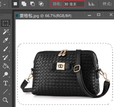 (3)使用矩形选框时,可以修改选框的羽化值,把羽化值改为“30像素”,选中“菱格包”区域,如图2-40所示。将羽化的选框拖拽放入“箱包背景1”,调整大小位置,如图2-41所示。未使用羽化功能的选框工具,选取的区域边缘非常清晰;使用羽化功能的选框工具,选取的区域边缘不生硬,过渡更加柔和。