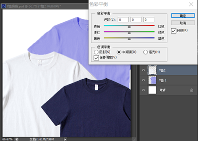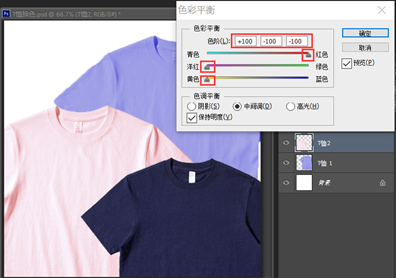 2、使用“色彩平衡”工具为“T恤2”更换颜色