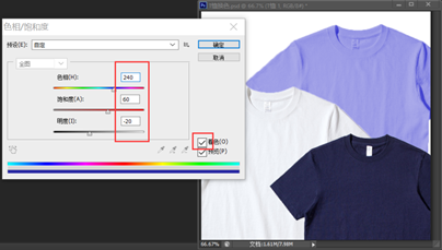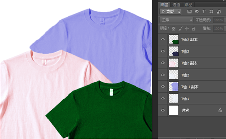 3、查看三个T恤图层更换颜色前后对比,如图3-32、3-33所示。若颜色不满意可根据以上步骤进行修改。
