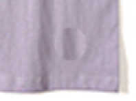 在Photoshop中打开“纯色T恤3”素材,选择“污点修复画笔工具”,修复深紫色T恤。按快捷键Ctrl+“+”,放大图片素材,调整好画笔大小,把鼠标移动到文字处(如图3-37所示),在文字上分别多次单击鼠标,直至修复完毕,如图3-38所示。每次单击,都会自动识别文字周围图案像素,匹配到需要修复的位置。