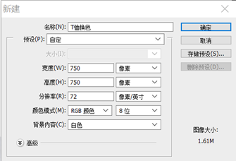 打开菜单栏“文件”→“新建”,新建750*750像素文件(如图3-23所示),命名为“T恤换色”。