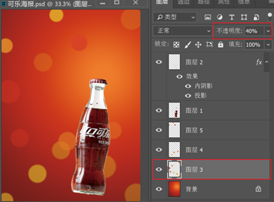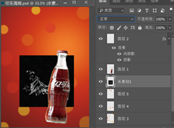2、将可乐和水珠两个图层合并,按Ctrl键选中两个图层(如图6-24所示),可以Ctrl+E合并两个图层。或者选中两个图层,点击下方