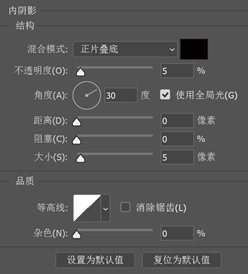 5、双击“图层1”或右击“图层”选择“混合选项”,出现“图层样式”的窗口,调整“内阴影”和“投影”的参数,如图6-20、6-21所示。
