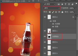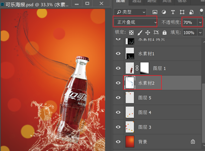 1、将“水素材1”放进“可乐海报”里,如图6-36所示。该图层类型调整为“滤色”,如图6-37所示。