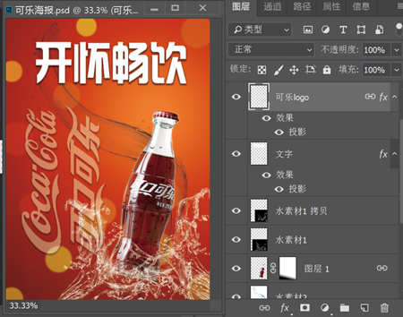 4、将存好的“开怀畅饮”文字和“可乐logo”放进“可乐海报”中,调整两个素材的大小和位置,给这两个图层添加阴影效果,如图6-50所示。投影效果可以参照可乐瓶水珠的制作方法。“可乐logo”图层可调低不透明度,完成海报并保存为.PSD和.jpg两种格式,如图6-51缩水。