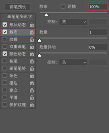 6、点击“散布”(如图6-33所示),参数调整为100%,点击“颜色动态”(如图6-34所示),勾选“应用每笔尖”,前景/背景抖动为15%,色相抖动为15%。