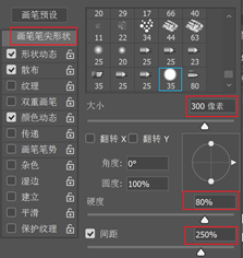 5、根据需要设置画笔参数,点击“画笔鼻尖形状”选择圆形硬画笔(如图6-31所示),大小为300像素,硬度调整为80%,间距为250%,点击“形状动态”(如图6-32所示),调整大小抖动为60%,最小直径为50%。