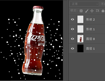 2、单击画面自动新建形状图层,拖动鼠标将形状覆盖在“可乐”素材图上,“形状1”根据素材大小调整形状,留意瓶身上的小圆点数量,继续覆盖一层“艺术效果6”,“形状2”稍微移动位置,即是增加瓶身上的小圆点,右击栅格化“形状1”和“形状2”,6-16所示。为了让大家看清“艺术效果6”的形状,添加了黑色背景图层。