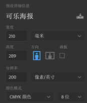 设计尺寸为印刷标准16k宣传单页,因此新建宽为210毫米(如图6-23所示),高为289毫米,分辨率为200像素/英寸的文件,颜色模式为CMYK,命名为“可乐海报”。注意宽高尺寸的单位是毫米。