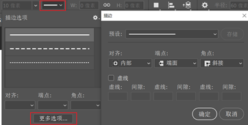 (1)描边(如图6-54所示)是选择线条类型,直线或虚线,可设置描边对齐、端点、交点,如果是虚线,还可以设置虚线的间隙像素。
