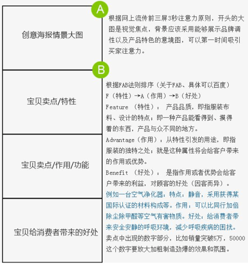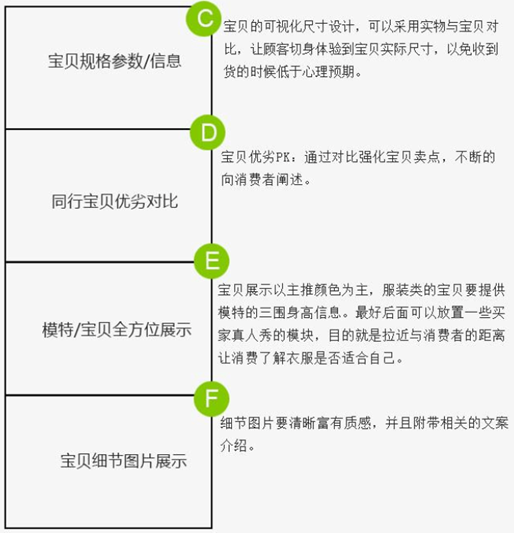 商品详情页主要描述需要激发消费者的购买欲望,把商品优势通过图片和文案的形式对外展示。以下图例是详情页的主要描述模块,但是在详情页中不一定全部展示完,看自己详情页设置的需要。