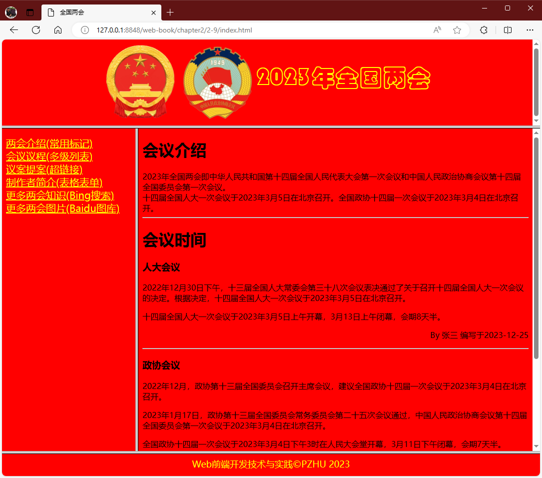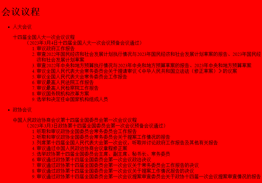 在“人大会议”中使用定义列表dl显示详细内容,其中“十四届全国人大一次会议议程”使用dt显示,“(2023年3月4日十四届全国人大一次会议预备会议通过)”及后续详细议程使用dd显示;