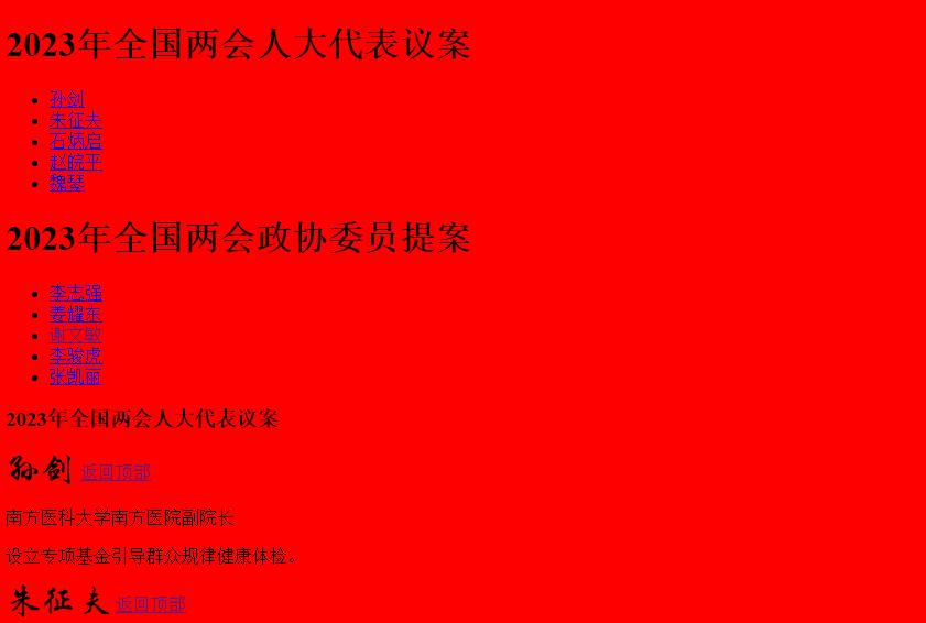 使用一级标题h1显示“2023年全国两会人大代表议案”和“2023年全国两会政协委员提案”(代表及委员前面的标题);