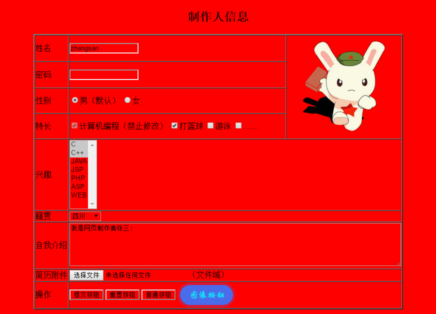 按照图示在表单中设计文本框、密码框、单选框、多选框、滚动列表、下拉列表、多行文本、文件域、普通按钮、提交按钮、重置按钮、图像按钮等。